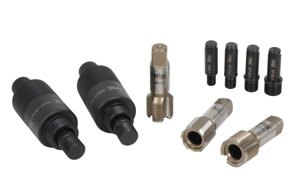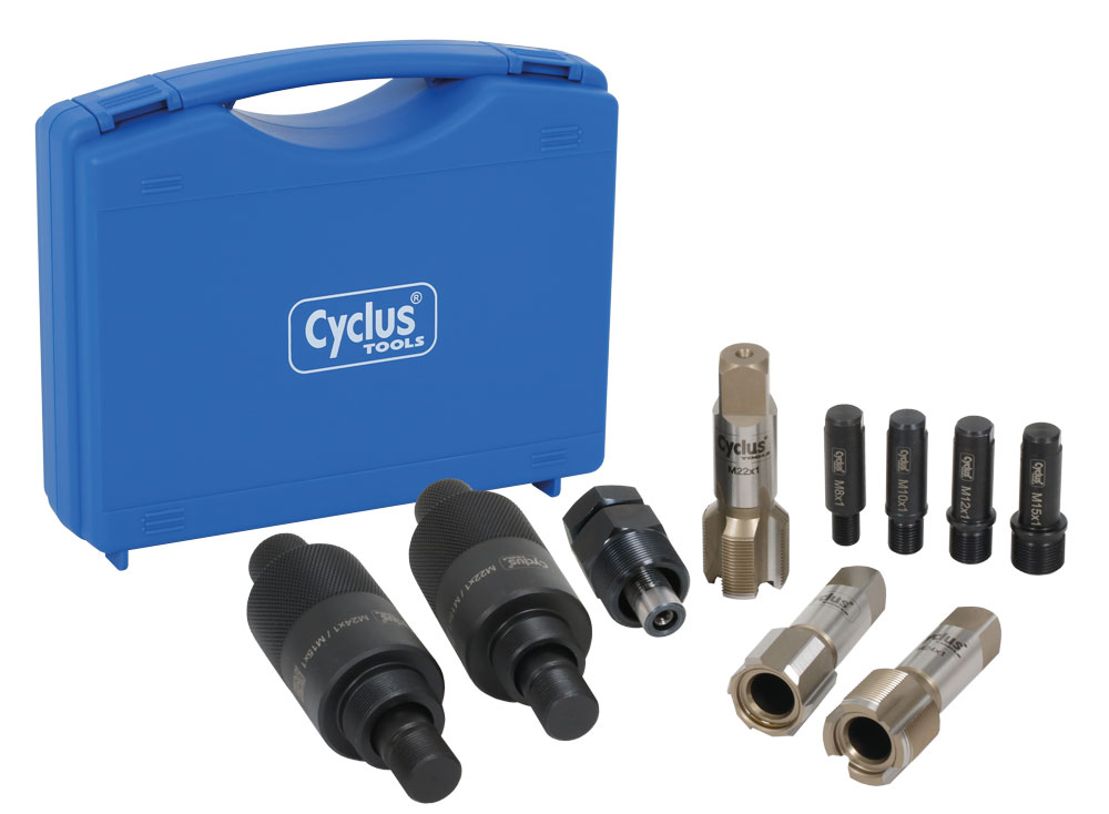 - You can recut existing crank threads with the M22x1 tap or cut a new, larger thread in the crank with the M24 core hole cutter and the M24x1 recutter. To work accurately and safely in the process, the set includes the matching guides.