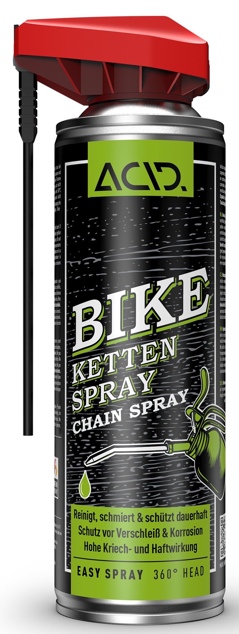 The ACID Bike Chain Spray ensures that all moving parts on the bike continue to run smoothly by cleaning and permanently lubricating the chain, chainring and sprocket. Thanks to its pronounced creeping and adhesive properties as well as its water-displacing effect, the spray offers long-term protection against wear and corrosion without becoming resinous.