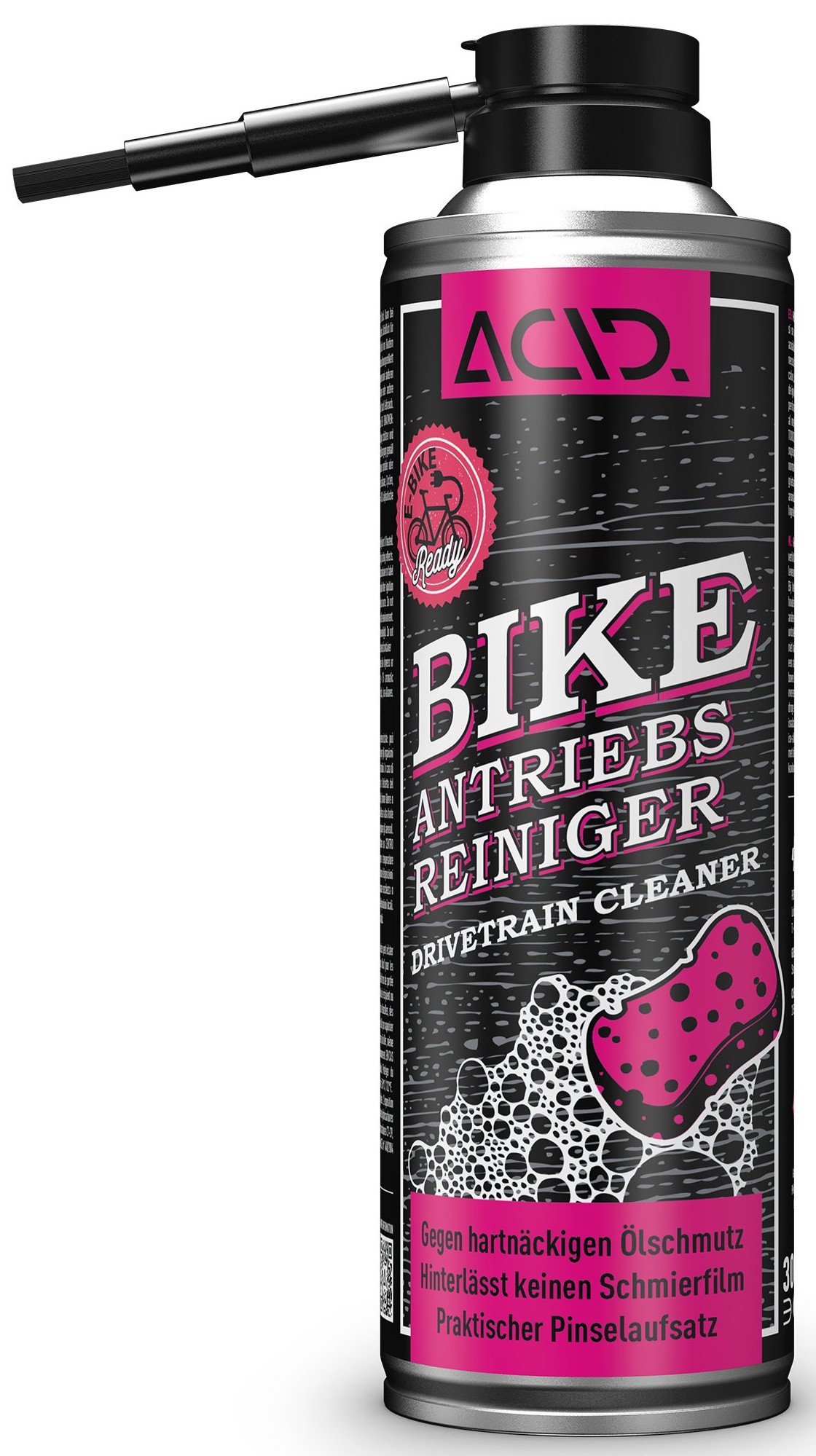 The ACID Bike Drivetrain Cleaner has been specially developed to remove old oil deposits, sand and other stubborn dirt from the drivetrain of bicycles without affecting the essential basic lubrication. With its practical brush attachment, the cleaner also reaches inaccessible gaps to achieve a thorough cleaning result. The high quality guarantees reliable and effective cleaning. If unpainted surfaces and carbon are indirectly affected by the cleaning process, compatibility with the surface should be tested in advance on an inconspicuous area.