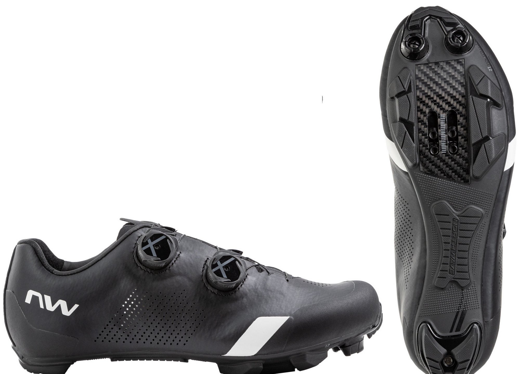 CARBON XC 12 - Extremely stiff when pedaling, thanks to the full carbon insert in the pedal area, but also ideal for long distances, thanks to the additional flex in the midfoot area. Developed with TPU inserts at strategic points to ensure high traction and excellent abrasion resistance.