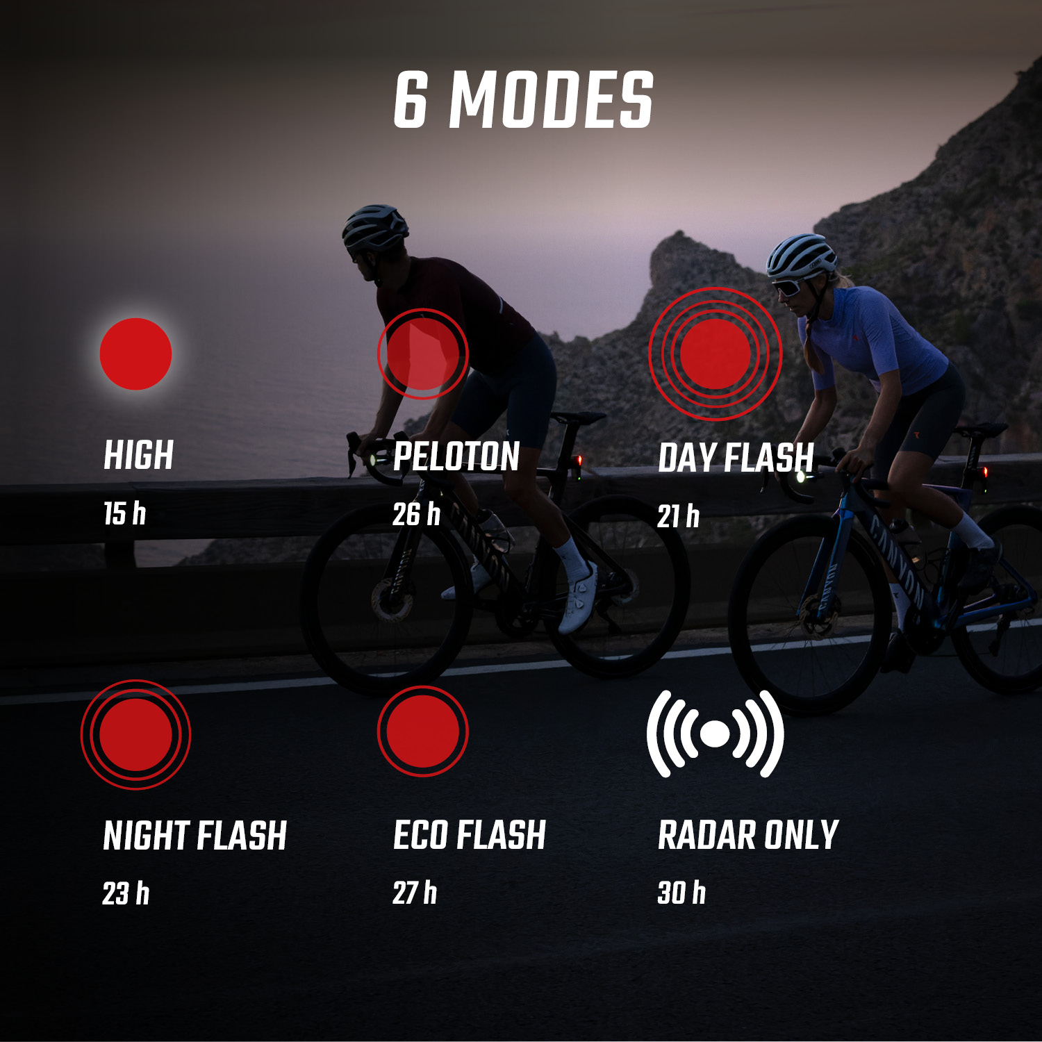 - Modes Six modes: High (up to 15 h), Peloton (up to 26 h), Day Flash (up to 21 h), Night Flash (up to 23 h), ECO Flash (up to 27 h), Radar only (up to 30 h)