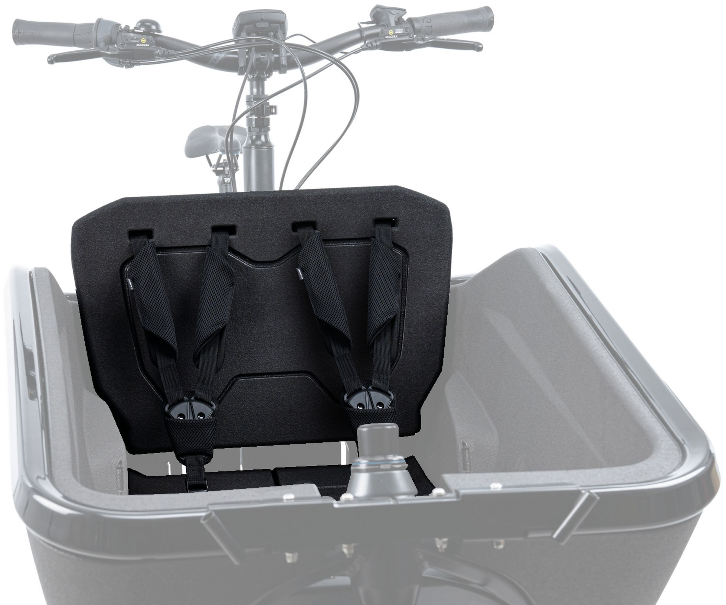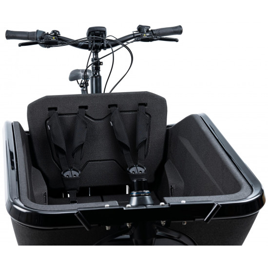 The seat set for the cube cargo bike has everything you need to transport up to two kids safely and in style. They'll stay sitting pretty courtesy of the comfortable ergonomic design. Or you can remove the seat in a flash to make room for those less precious but just as important cargo loads. Three-point harnesses with magnetic fidlock closures and soft padding keep the little ones securely in place without causing discomfort or pressure so that every family ride is a pleasure.