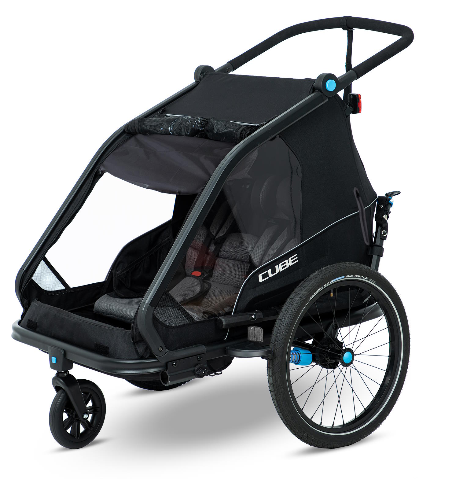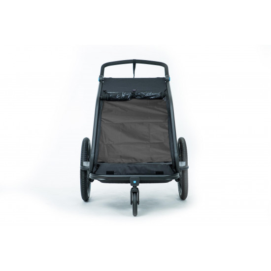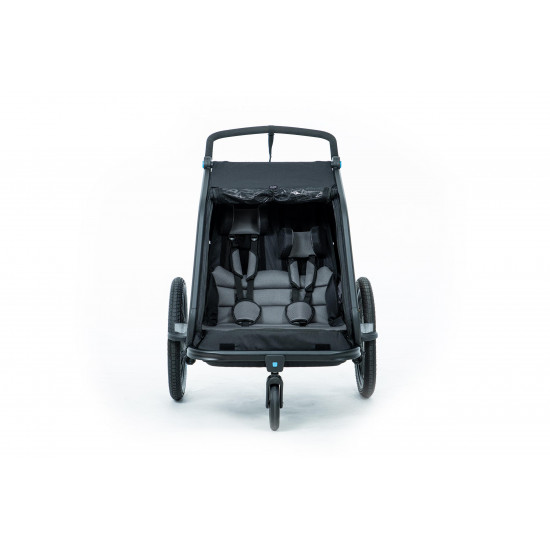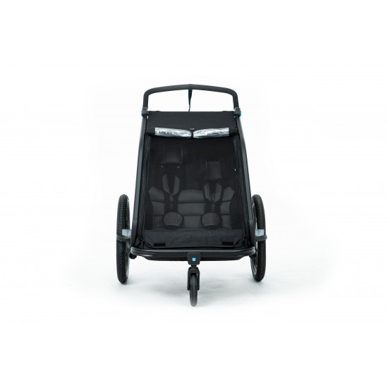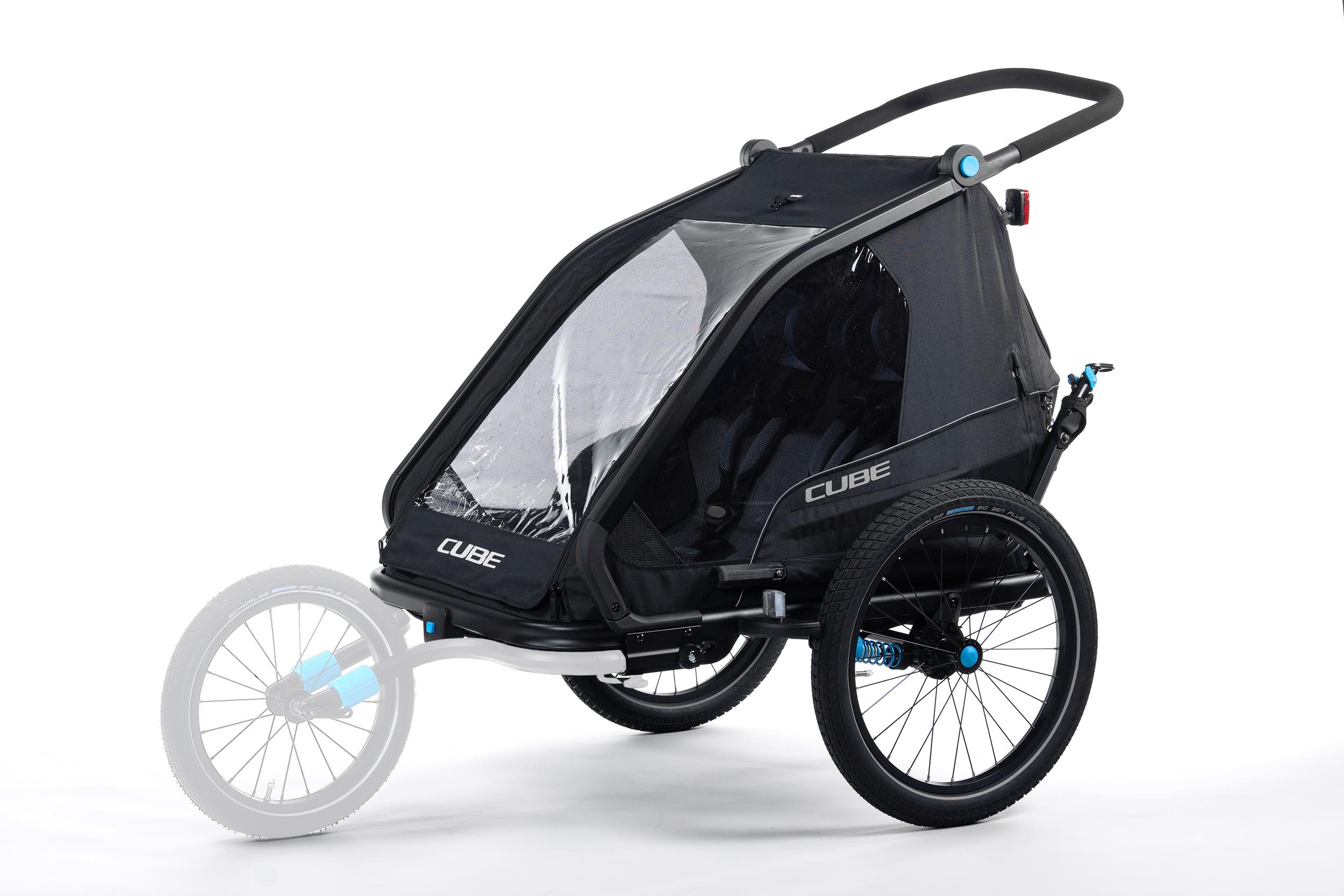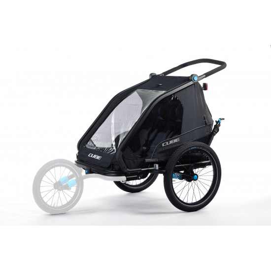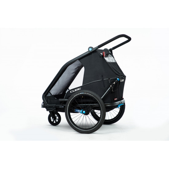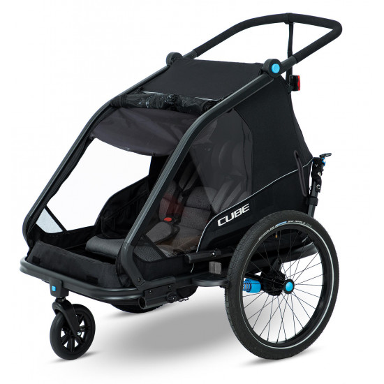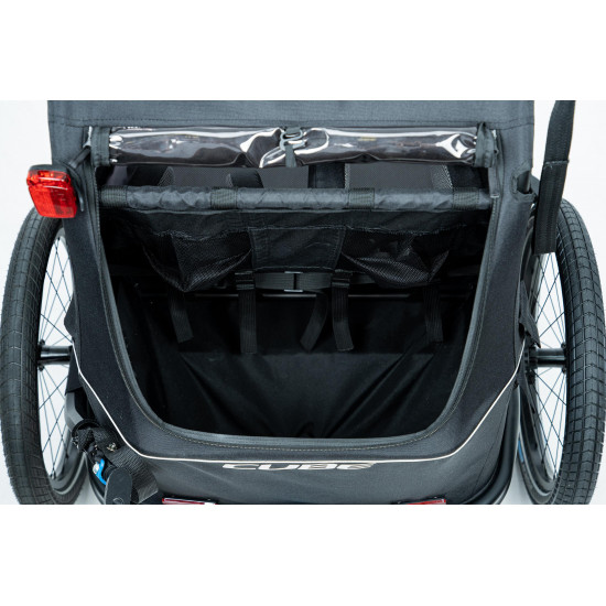 The CUBE Kids Trailer Double CMPT is the perfect everyday companion. This sophisticated multi-talent is a bike trailer and kids' buggy in one. A large insect net across the front and sides keeps the bugs out without affecting the circulation of fresh air. Kids can nap in peace courtesy of the sun shade to protect against the bright light. The splash protection means you can keep riding even when it's muddy and wet outside while the kids stay dry. Seat and back padding and a headrest with helmet pocket make sure the little ones ride in comfort. Individually adjustable suspension can be adapted to the terrain and loading weight. For even more flexibility, the trailer is compatible with the Jogger Kit (available separately).