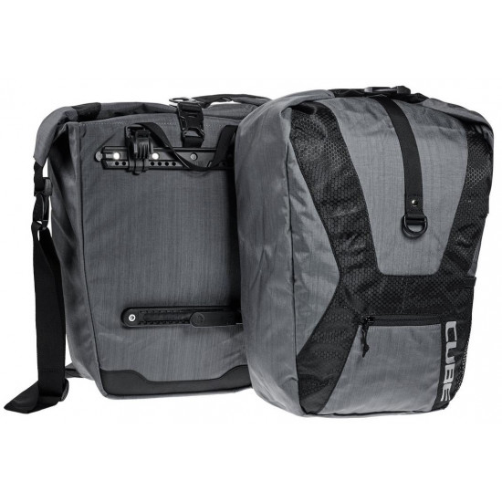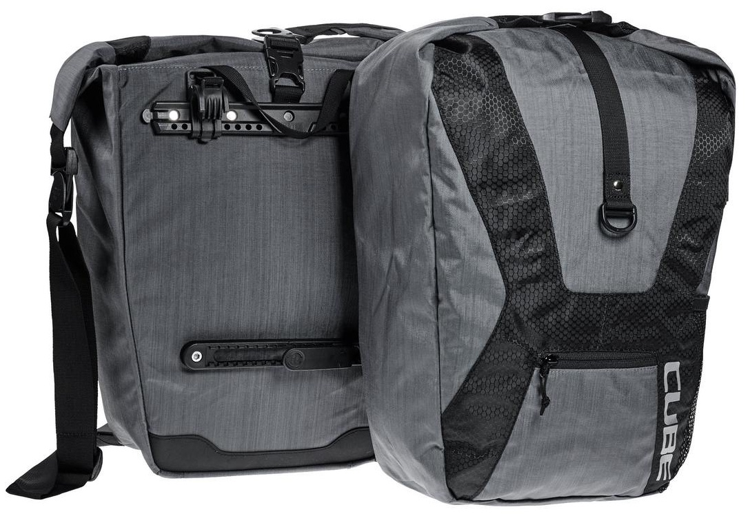 One pair of bike pannier bagsQuick release buckle for easy attachment to the rackRoll closureInside pocketAdjustable and detachable shoulder strapRaincoverMesh side pocketCompression strapsAsymmetrical designSIZE: (LxBxD) 42 x 30 x 18 cmMATERIAL: 100% polyesterCAPACITY: 40 litres