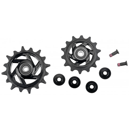 The Pulley Kit contains the jockey wheels for the SRAM X0 Eagle Transmission rear derailleur (RD-X0-E-B1). Guide pulley (top, 14 teeth) and tension pulley (bottom, 16 teeth) including two T25 stainless steel bolts.
