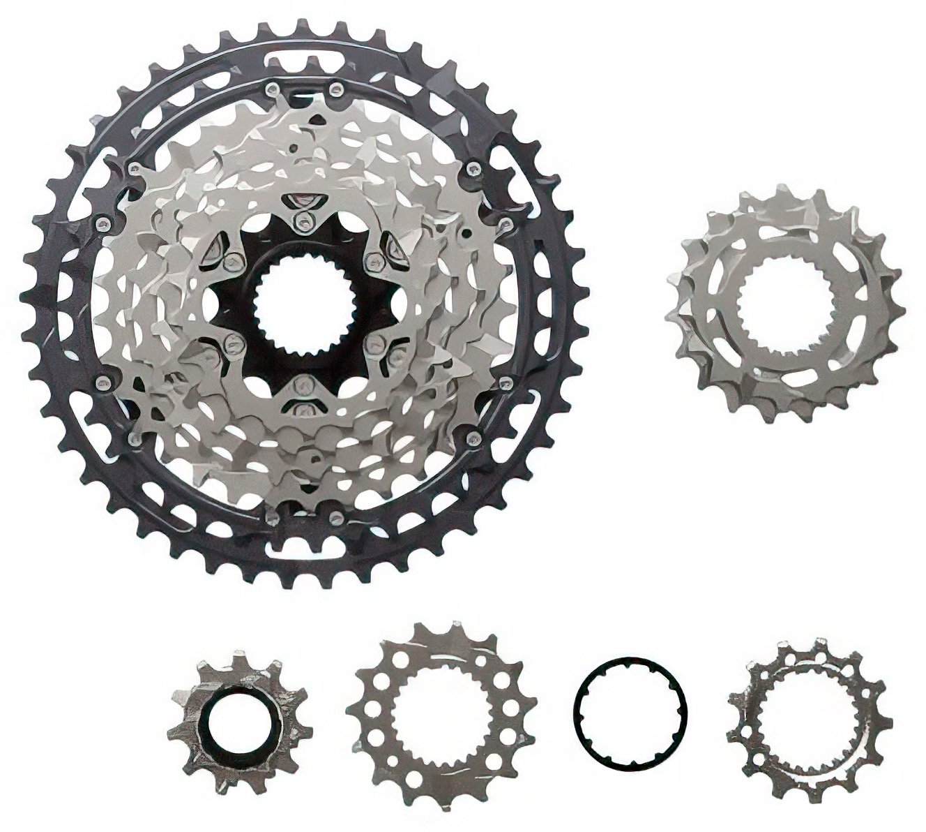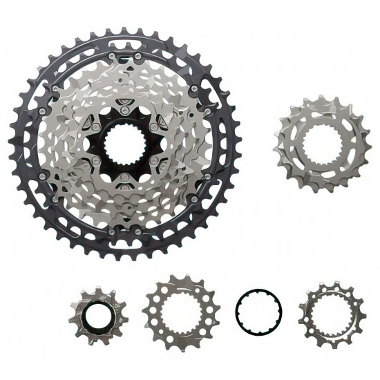 - Material: Sprockets (small) - Aluminum (anodized; 10x at 10-51T), Sprockets (large) - Steel (plated; 2x at 10-51T), Spider - Aluminum (painted), Lock ring - Aluminum (anodized)