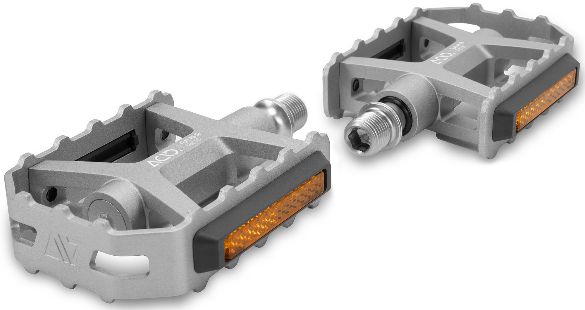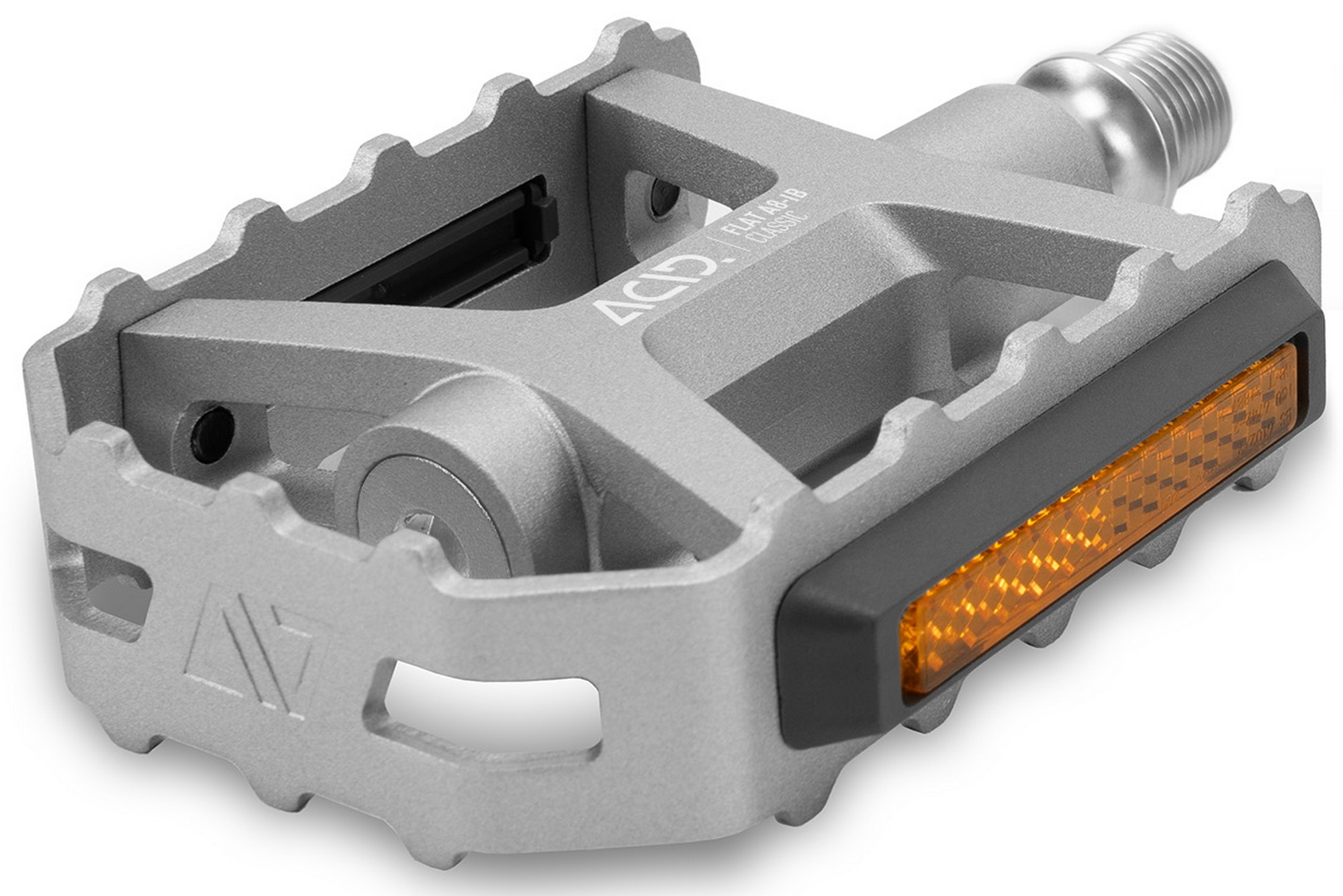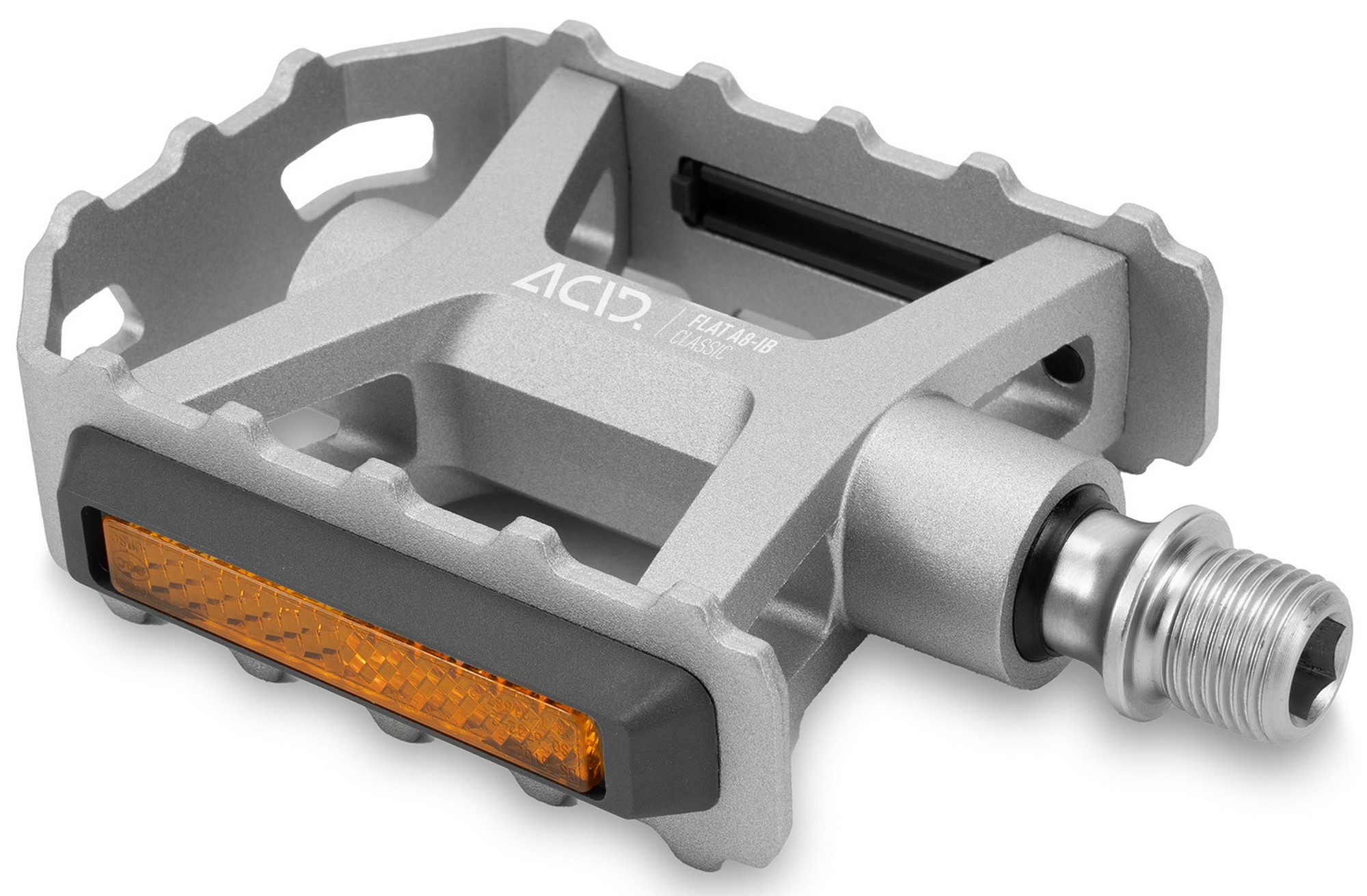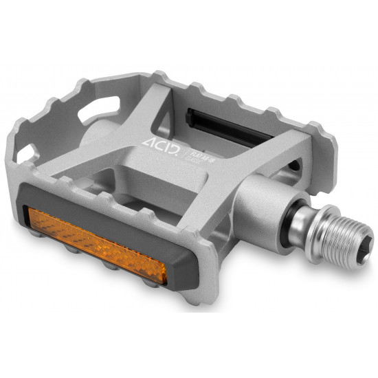 The acid pedal flat a8-ib classic features an aluminium cage with integrated pins for secure grip with any footwear. Combined with its classic design and silver colour scheme, it's a good match for a wide range of bikes and for all kinds of riding. The durable, cnc-machined cr-mo axle runs on a sealed industrial bearing and an lsl bushing, for long service life and smooth performance. And the stvzo-certified reflectors ensure compliance with german road traffic regulations and improved visibility to other road users.