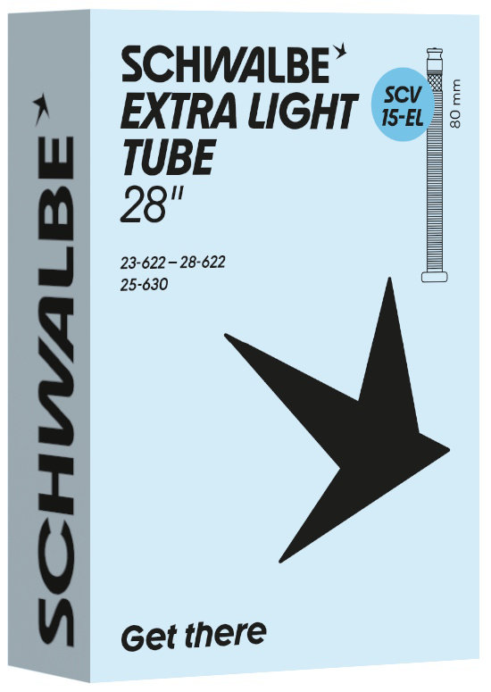 Schwalbe EXTRA LIGHT bicycle inner tube no. 15-EL. For bicylce tires in 28" inch (ETRTO 23/28-622, 25-630). Lower weight, with the same reliability as a Schwalbe standard inner tube.