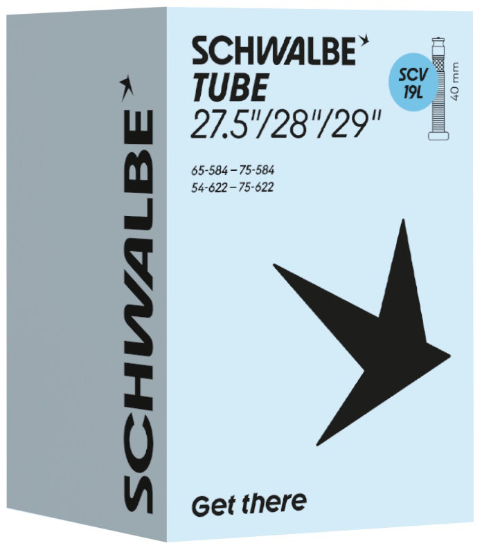 Schwalbe standard bicycle inner tube no. 19L. For bicycle tires in size 27.5"/28"/29" inch (ETRTO 65/75-584, 54/75-622). Holds air for an above-average length of time. Thanks to the best material quality and uniform wall thickness. Maximum reliability that has proven itself millions of times over.
