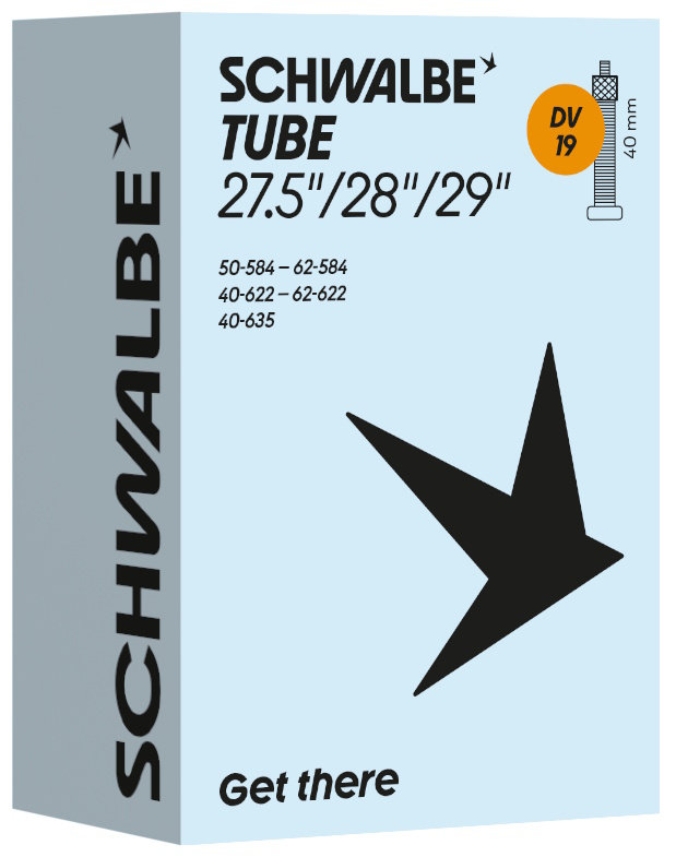 Schwalbe standard bicycle inner tube no. 19. For bicycle tires in size 27.5"/28"/29" inch (ETRTO 50/62-584, 40/62-622, 40-635). Holds air for an above-average length of time. Thanks to the best material quality and uniform wall thickness. Maximum reliability that has proven itself millions of times over.