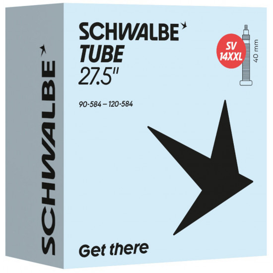 Schwalbe standard bicycle inner tube no. 14XXL. For bicycle tires in size 27.5" inch (ETRTO 90/120-584). The Schwalbe inner tube especially for fat bikes, with huge volume. For fatbike tires up to 120 mm wide. Retains air for an above-average length of time. Thanks to the best material quality and uniform wall thickness. Maximum reliability that has proven itself millions of times over.