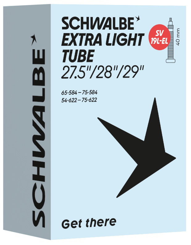 Schwalbe EXTRA LIGHT bicycle inner tube no. 19L-EL. For bicylce tires in 27.5"/28"/29" inch (ETRTO 65/75-584, 54/75-622). Lower weight, with the same reliability as a Schwalbe standard inner tube.