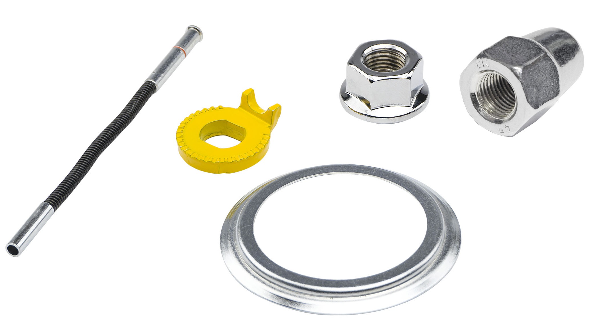 - Nut/Washer/Snap Ring: Cap nut, flange nut x1, without washer, snap ring