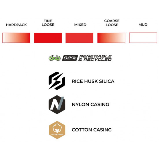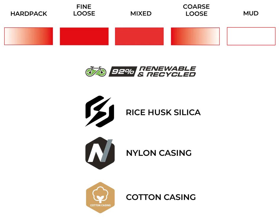 ECO RACE FORMULATION Next-generation compound blend developed specifically for competitive gravel racing, delivering exceptional speed and grip across varied terrain. Renewable and recycled ingredients include Fair-Rubber certified natural rubber, soybean oil and rice husk ash silica.